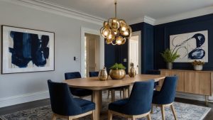 Navy can be bold, so consider using it on a feature wall, cabinetry, or sofa while keeping walls and larger surfaces in white or off-white. The dark hue anchors the room, while white opens it up, creating balance.