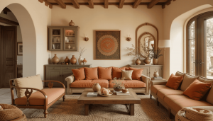 Balance boldness with plenty of cream or off-whiteon walls, flooring, or larger furniture to prevent the space from feeling heavy. Add rustic elements like terracotta pots, linen fabrics, and antique brass for cohesion.